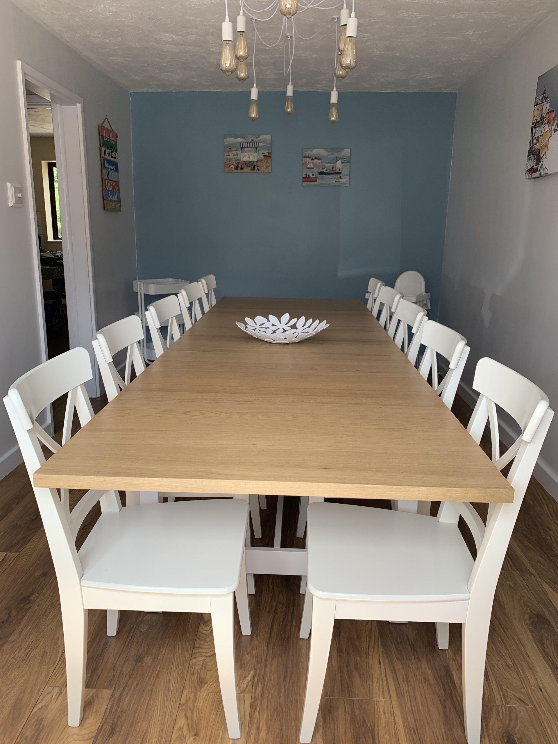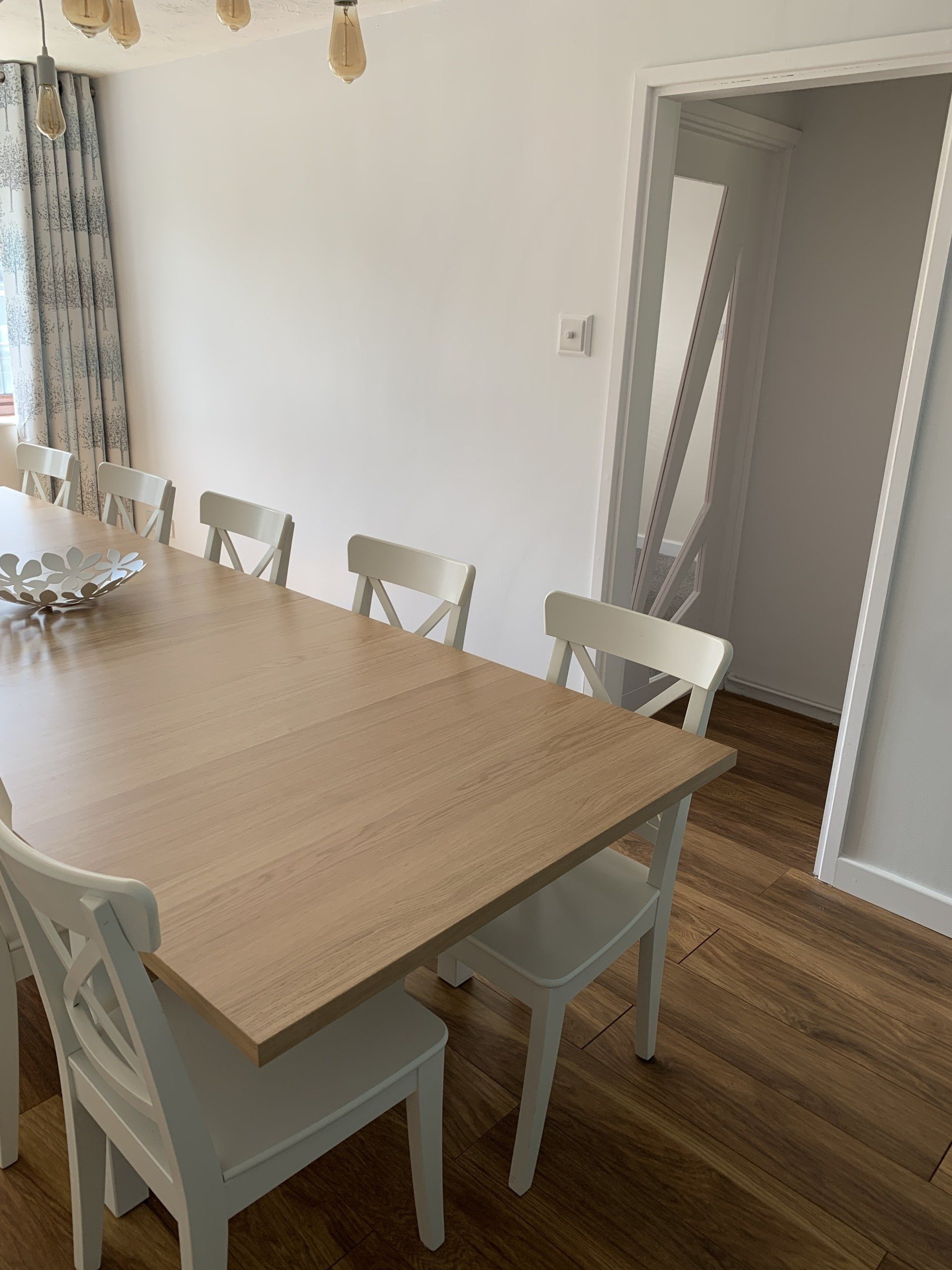 The dining room at 32 Sandy Lane can seat up to 10 people. With easy access to the kitchen, this is an ideal place to host dinner parties.